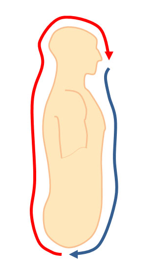Looking at other published accounts of the kundalini energy flow, I noticed that it is not just an upwards flow, but that it moves to the head and then descends the front of the body. This pattern is identical to the flow of energy in Small Circulation qigong, also known as the microcosmic orbit, illustrated below: